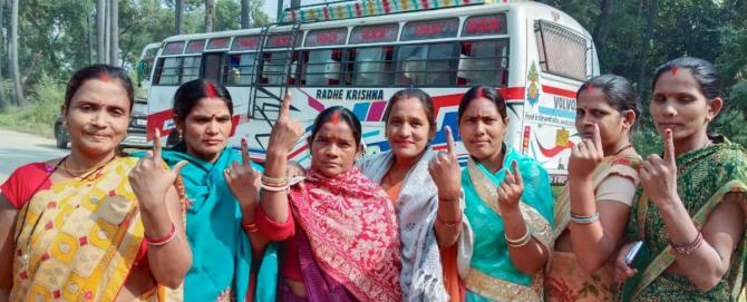 IMAGE: Women voters show their fingers marked with indelible ink after casting their vote in the second phase of the Bihar assembly election on Tuesday, November 11, 2025. Photograph: @CEOBiharX/ANI Photo
