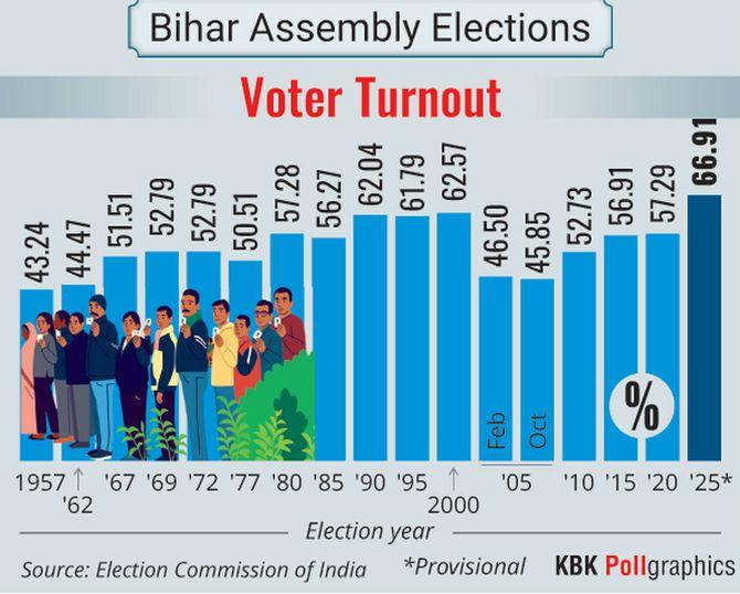According to data available from Election Commission of India, Bihar saw 66.91 per cent (provisional) voter turn out in these elections.