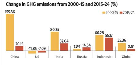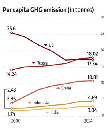 Still, India's per capita emissions remains far lower than China (10.8 tonnes), Russia (18 tonnes), the US (17.3 tonnes) and even Indonesia (4.69) in 2024.