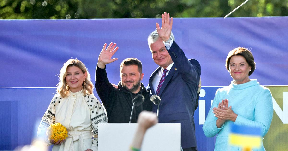 IMAGE: Ukrainian President Volodymyr Zelenskyy, his wife Olena Zelenska, Lithuanian President Gitanas Nauseda and his wife Diana Nausediene attend a ceremony during which an Ukrainian flag from the frontline of the war with Russia was delivered by activists on the sidelines of the NATO leaders summit. Photograph: Kacper Pempel/Reuters