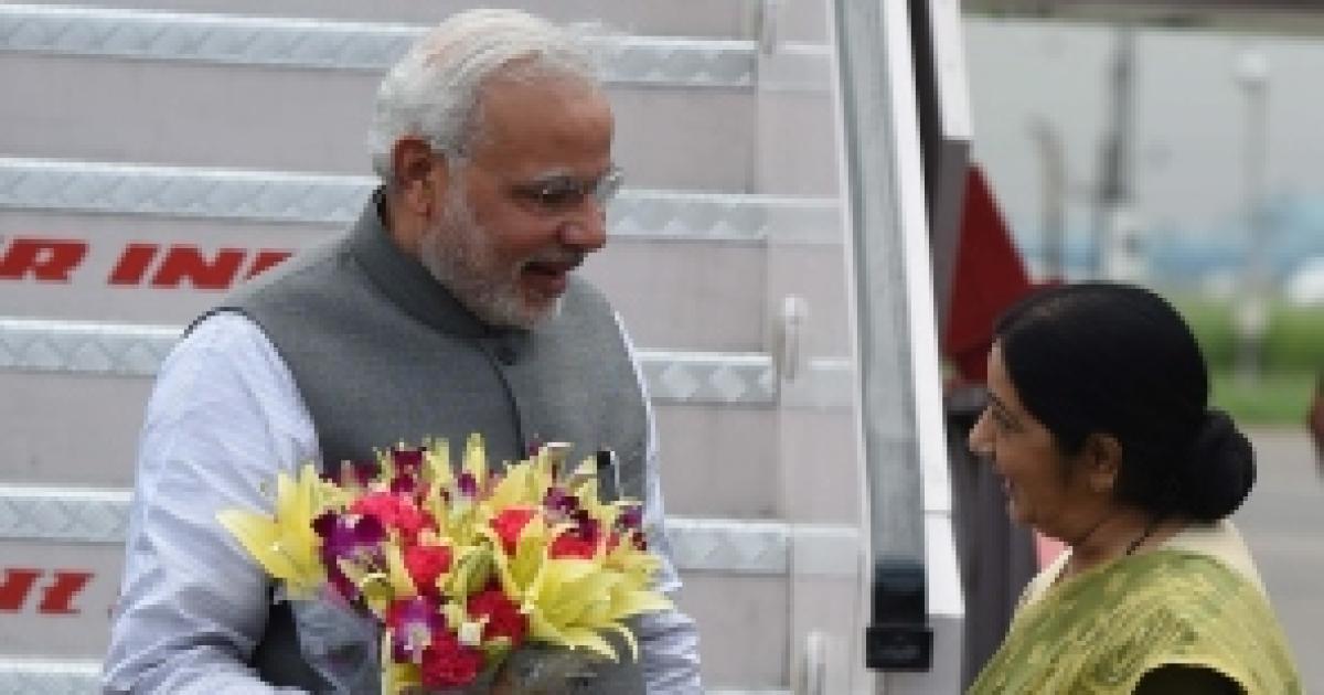 Prime Minister Narendra Modi is received by Minister of External Affairs  Sushma Swaraj in New Delhi. Photograph: MEA