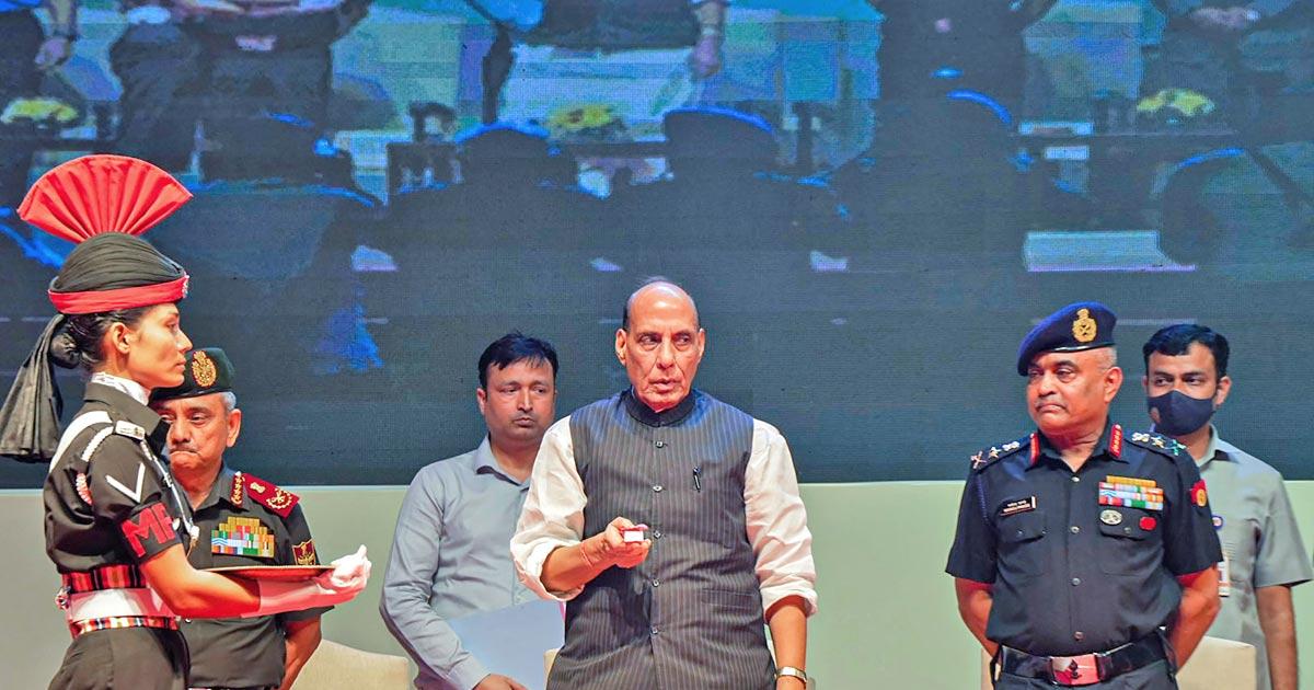 IMAGE: Defence Minister Rajnath Singh, fifth from left, with, from left, former army chiefs General Dalbir Singh Suhag (retd) and General Nirmal Chander Vij (retd), Chief of the Air Staff, Air Chief Marshal Vivek Ram Chaudhari, Chief of Defence Staff General Anil Chauhan, Chief of the Army Staff General Manoj Chandrashekhar, Pande, Vice Chief of the Naval Staff Vice Admiral Satishkumar Namdeo Ghormade, former army chief General Ved Prakash Malik (retd), Neeraj Chopra and Deepa Malik with other dignitaries at the launch of www.maabharatikesapoot.mod.gov.in Photograph: ANI Photo