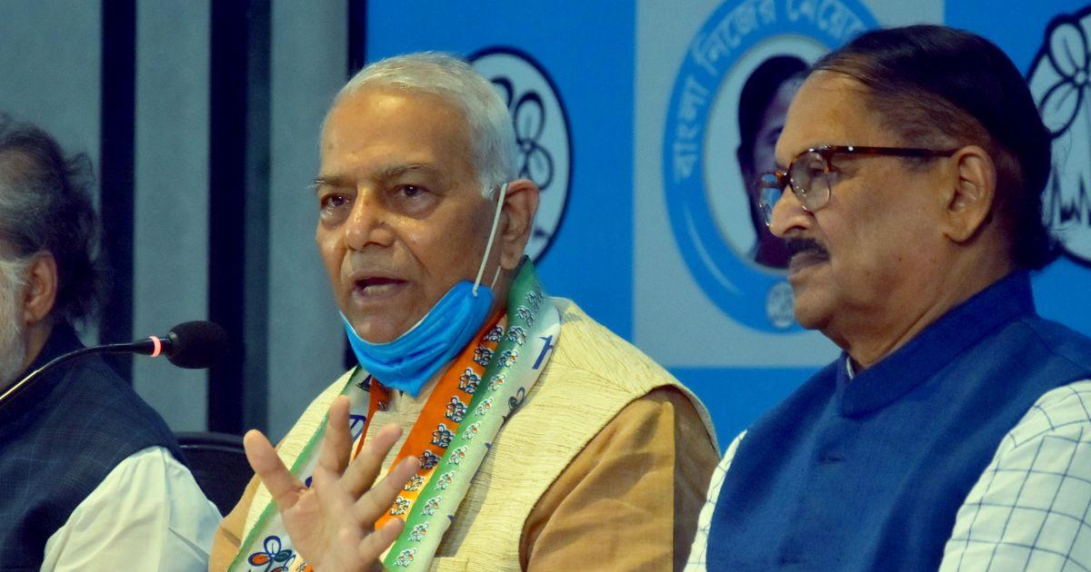 IMAGE: Former BJP leader and Union Minister Yashwant Sinha addresses as he joins TMC in Kolkata on Saturday. Photograph: ANI Photo