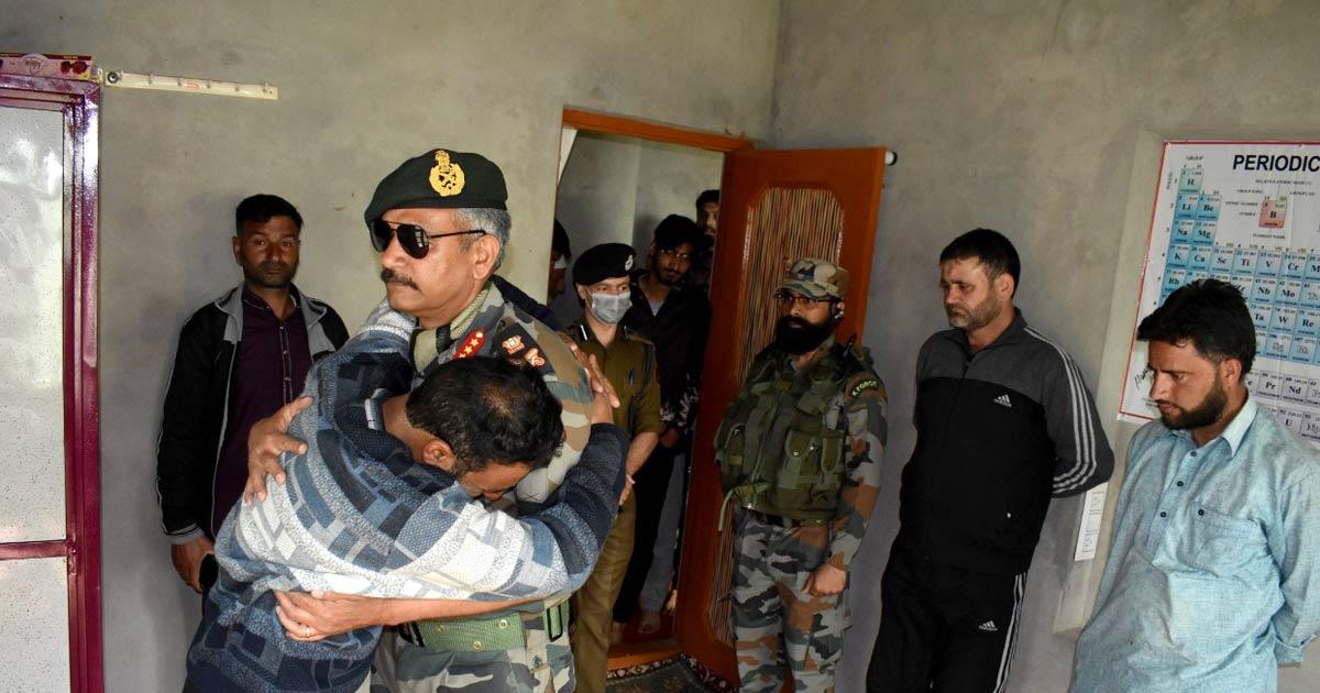 IMAGE: Chinar Corps Commander Lieutenant General Devendra Pratap Pandey visits the Budgam home of Special Police Officer Ishfaq Ahmad and his brother Umar Jan whom terrorists murdered on Saturday, March 26, 2022.