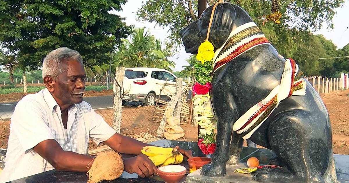 IMAGE: 82-year-old retired government employee Muthu offers prayers at the temple he has built in memory of his dog Tom, who died due to health issues, at Manamadurai, Sivaganga, Tamil Nadu.