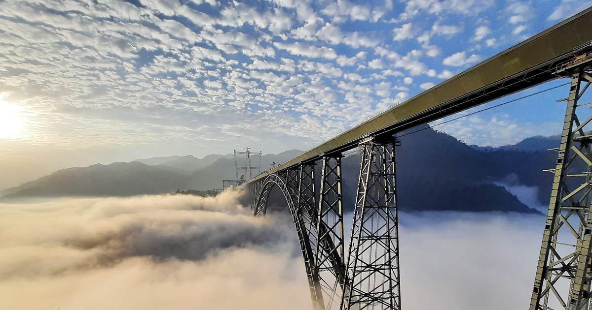 IMAGE: Clouds gather around the Chenab rail bridge at Kouri in Reasi, Jammu and Kashmir, September 13, 2022. All photographs: ANI Photo