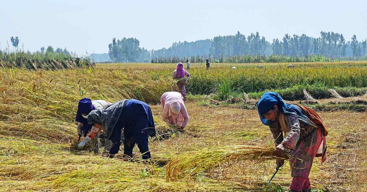 IMAGE: Women farmers work in a paddy field on the outskirts of Srinagar. All photographs: ANI Photo