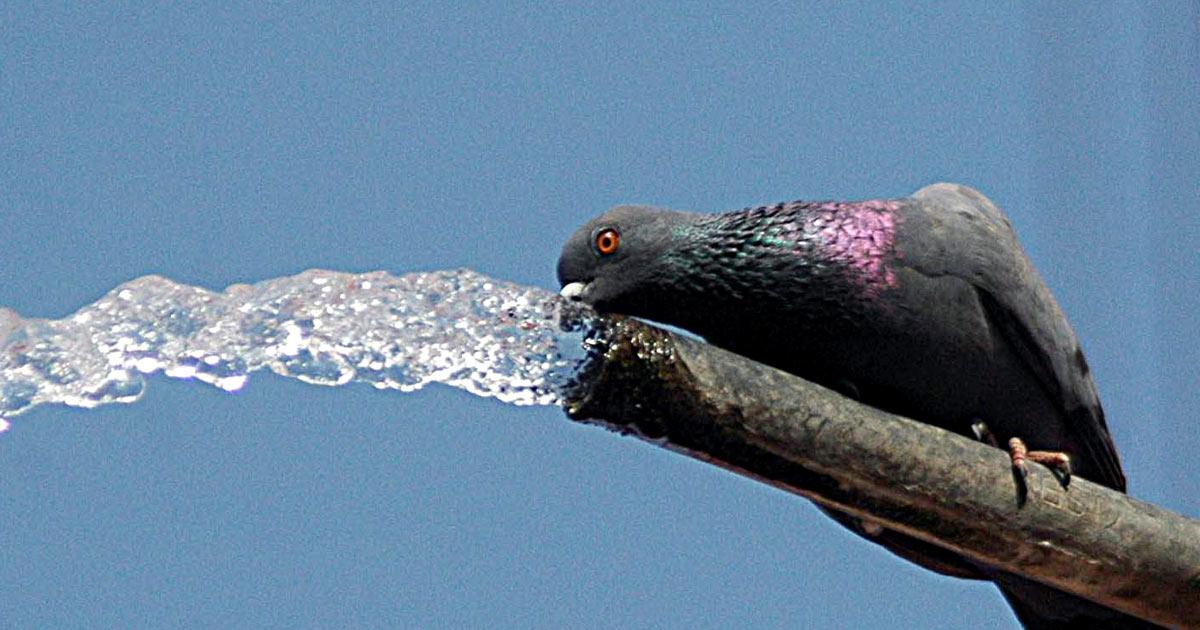 IMAGE: A clever pigeon quenches its thirst from a water outlet on a hot summer day in Prayagraj.
