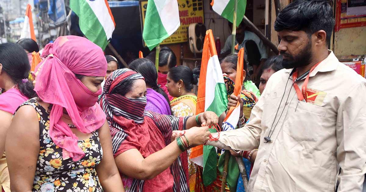IMAGE: Sex workers in Kamathipura, central Mumbai, tie a rakhi on the postman who brings them mail -- and this week, a gift of the Tiranga -- and on each other. All photographs: Sahil Salvi