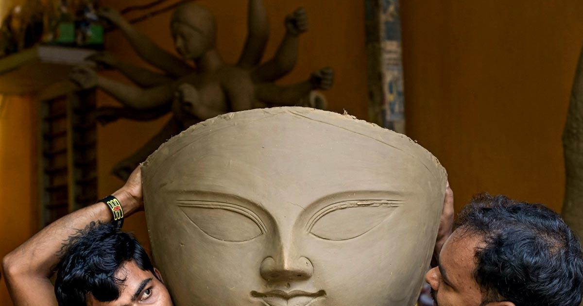 IMAGE: Workers carry the face of a clay model of Goddess Durga at a workshop to prepare idols ahead of the Durga Puja festival in Nadia district, August 26, 2022. Photograph: PTI Photo