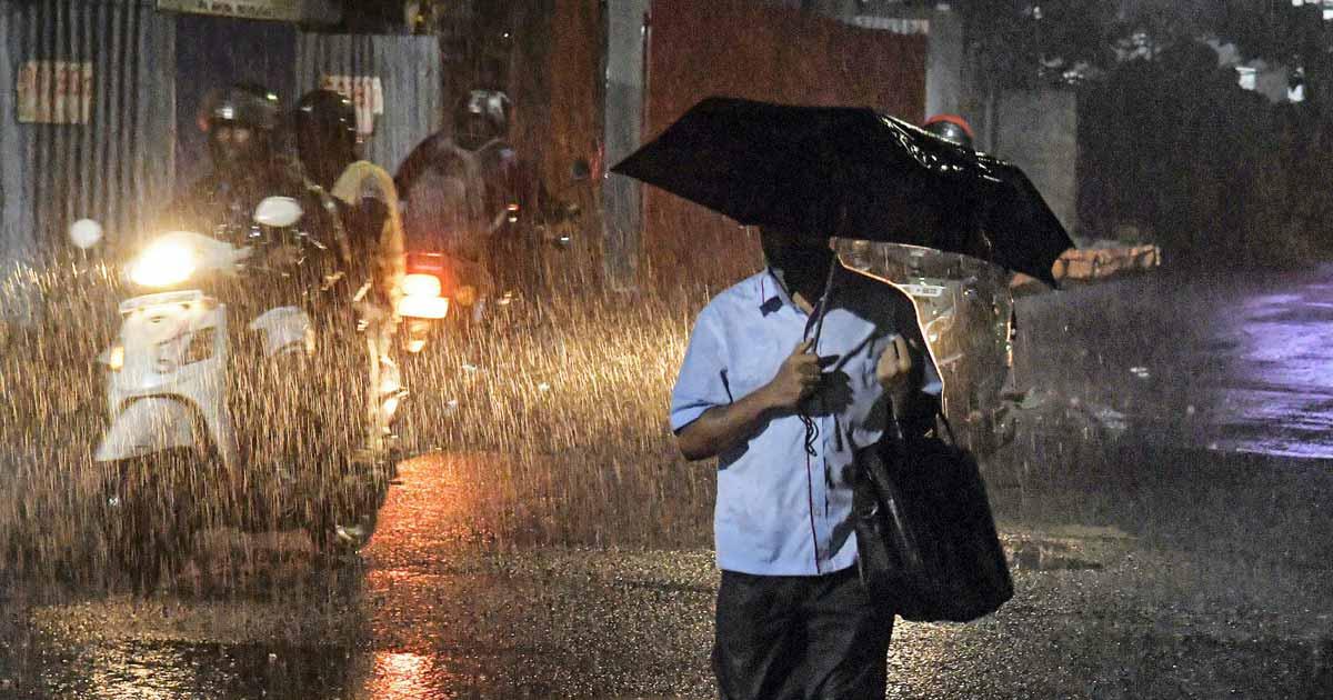 IMAGE: A man with an umbrella welcomes the rain in Thiruvananthapuram.