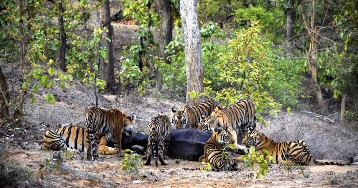 IMAGE: Tigress T28 trains hunting to three cubs of her dead sister along with four of her own at the Sanjay Dubri National Park and Tiger Reserve in Sidhi district, Madhya Pradesh. Photographs: PTI Photo