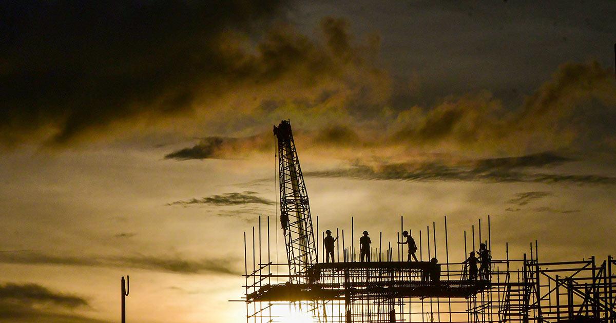 IMAGE: Construction workers are silhouetted against the setting sun at the site of the Mumbai Coastal Road project at Haji Ali, June 10, 2022.