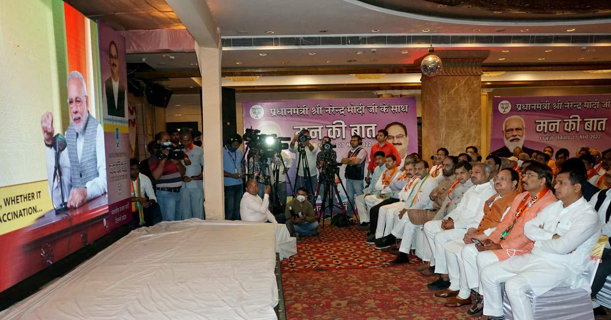IMAGE: Like a group of schoolboys listening to their principal, Bharatiya Janata Party National President Jagat Prakash Nadda along with BJP leaders Manoj Tiwari, Adesh Gupta, Anil Baluni and others hear Prime Minister Narendra Damodardas Modi's monthly broadcast Mann Ki Baat at the BJP HQ in New Delhi, March 27, 2022.