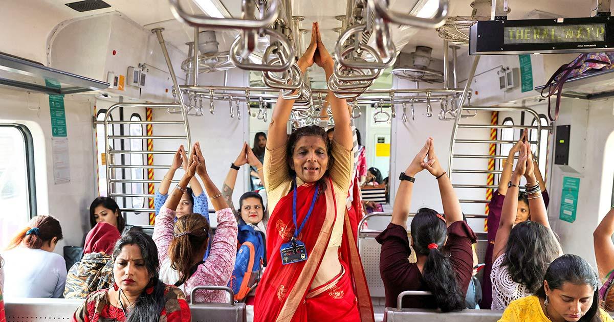 Glimpses of yoga sessions on a suburban train on the occasion of International Women's Day in Mumbai, India, March 8, 2023.