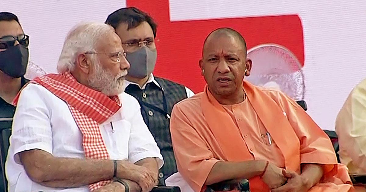 Behind Yogi is Manipur Chief Minister N Biren Singh; to his right is UP BJP chief Swantantra Dev Singh and behind Singh, Jiten Prasada, who left the Congress a few weeks before the election to join the BJP.