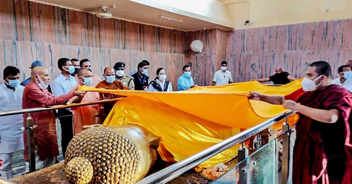UP Chief Minister Ajay Mohan Bisht -- aka Yogi Adityanath, mahant of the Gorakhnath Math since 2014 -- visited the Mahaparinirvana temple in Kushinagar on Tuesday, October 12, which Modi and Gotabaya will visit after their meeting, to ensure that everything was in order for the leaders's visit.