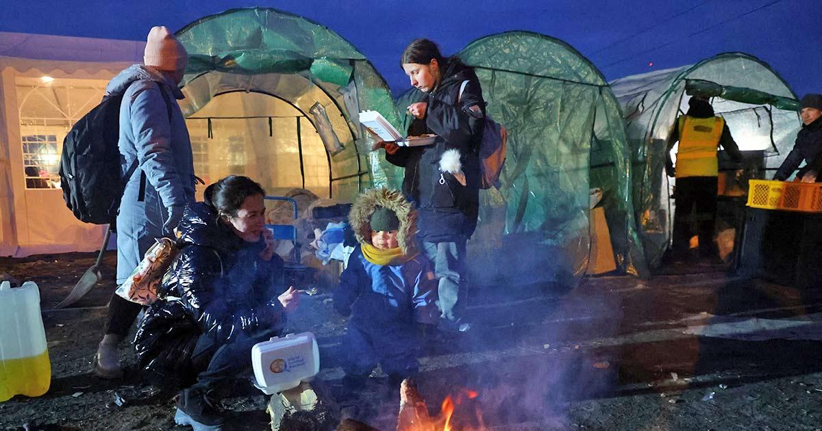 IMAGE: People fleeing the Russian invasion of Ukraine eat next to a bonfire after crossing the border to Poland, at the border checkpoint in Medyka, on March 7, 2022. Photograph: Fabrizio Bensch/Reuters