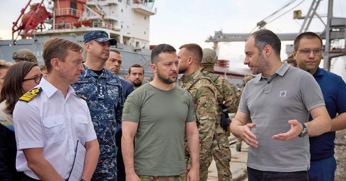 IMAGE: Ukraine's President Volodymyr Zelenskyy and Minister of Infrastructure Oleksandr Kubrakov visit a sea port before restarting grain export in Odesa. Photograph: Ukrainian Presidential Press Service/Handout via Reuters