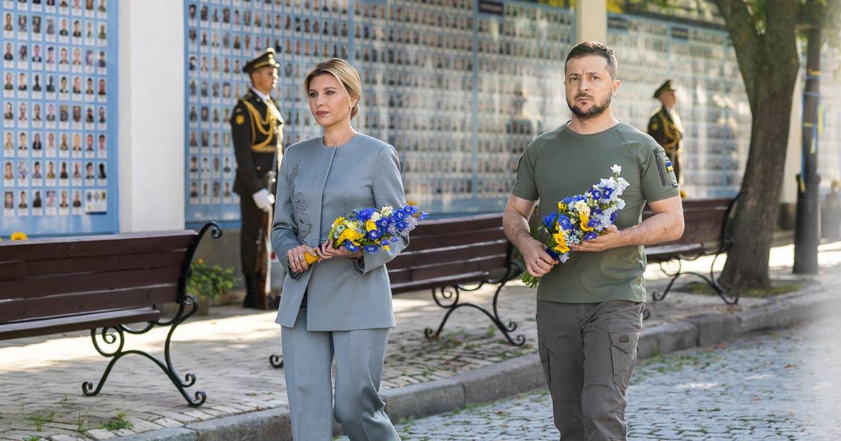 As Russia's invasion of Ukraine enters its seventh month, Ukraine's President Volodymyr Zelenskyy and his wife Olena Zelenska visited the Memory Wall of Fallen Defenders of Ukraine marking the Independence Day in Kyiv, August 24, 2022.