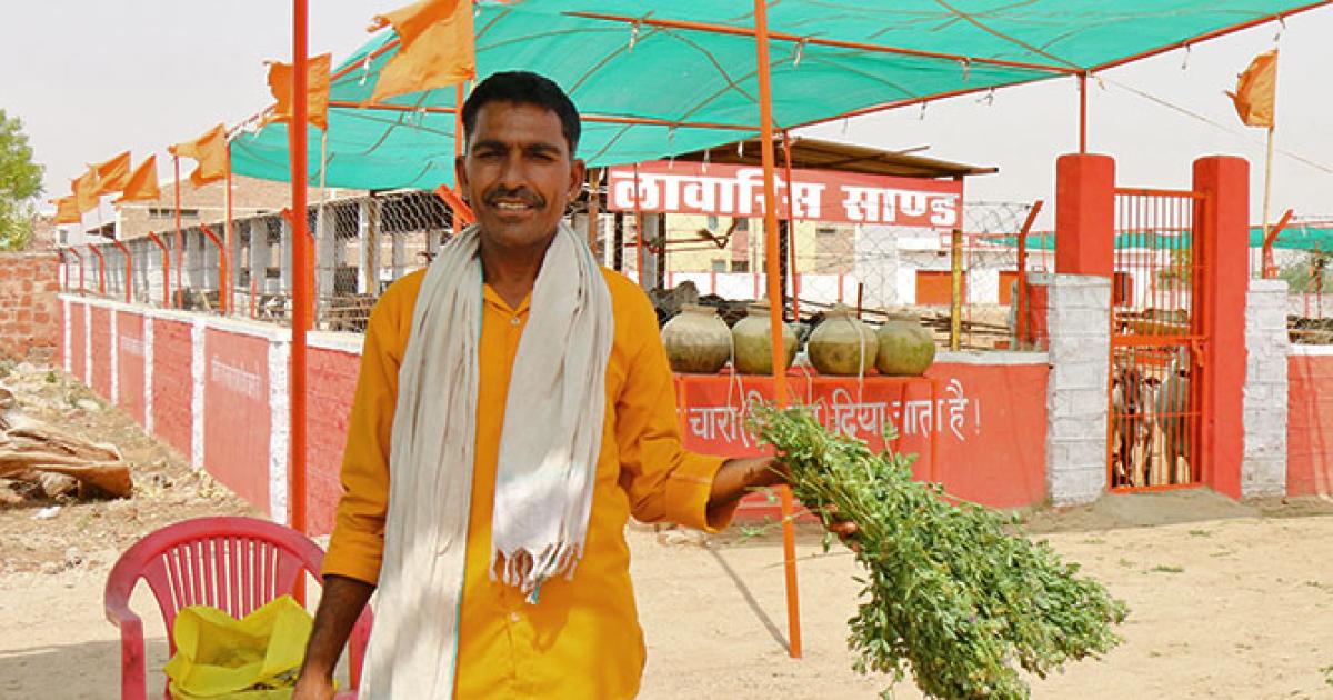 We screech to a halt seeing 'Lawaris sand' written on a large shed on the road to Jodhpur from Deshnoke. Kishtoram, a man in a bright yellow uniform, stands by the wayside selling green cattle feed or Rijga.