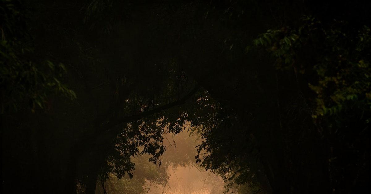 Surrounded by a tunnel of vegetation, two peahens are silhouetted against a peachy dawn sky in Keoladeo National Park, India.