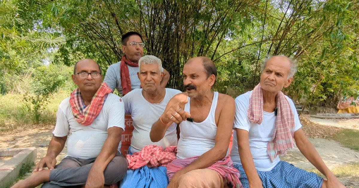 Some of the elders who attended Modi's rally are seated on a bench near the temple in Darshini.