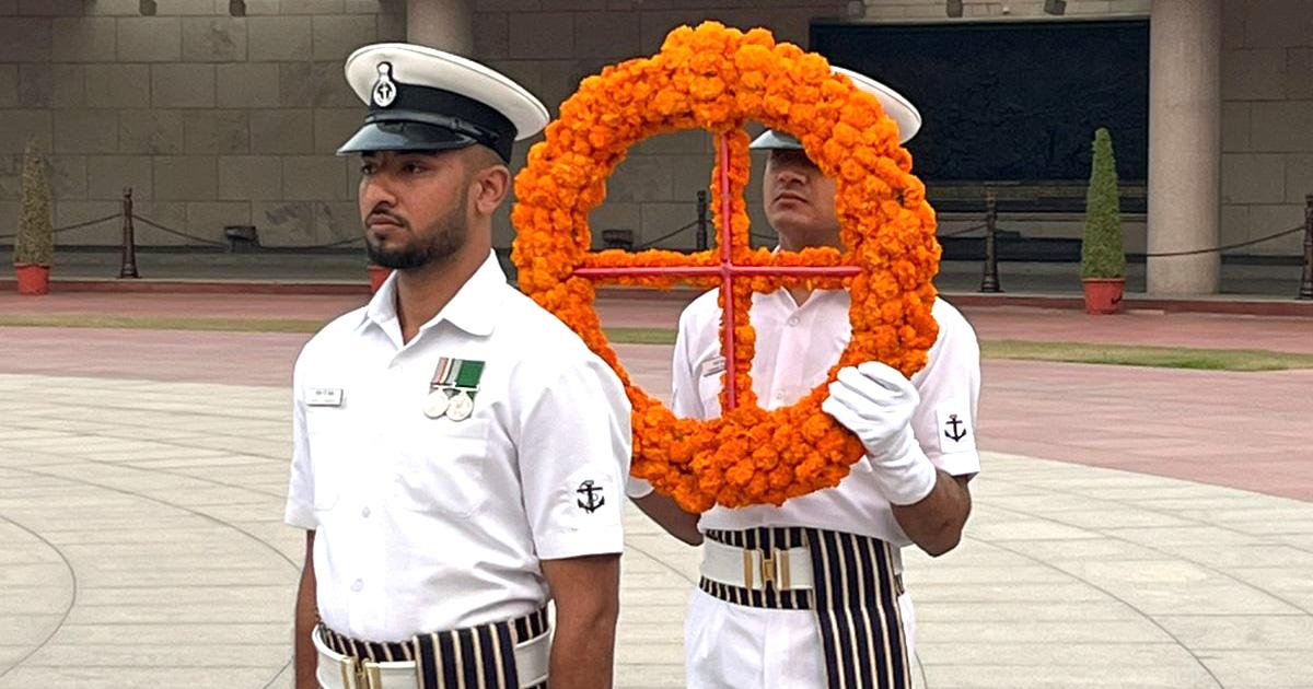 After Mrs Shahi laid the marigold wreath, the naval contingent conducted the beating retreat ceremony where the Tiranga along with the Army, Navy and Air Force flags are lowered.