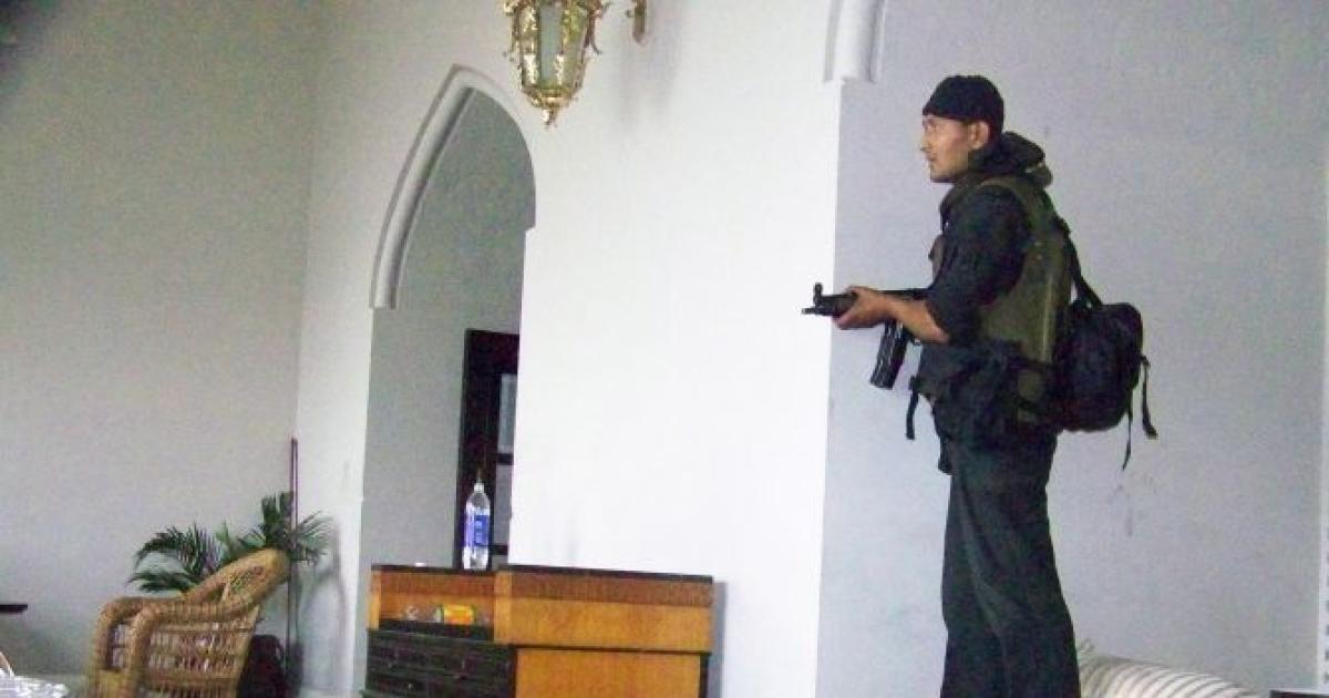 IMAGE: An NSG commando at the spot where the terrorist who shot Major Sandeep Unnikrishnan had positioned himself.