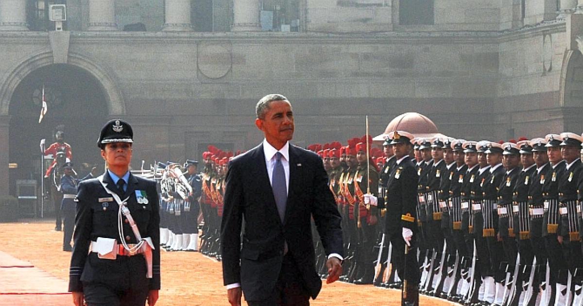 Image: Wing Commander Pooja Thakur marches behind US President Barack Obama during the Inter-Services Guard of Honour at Rashtrapati Bhavan.