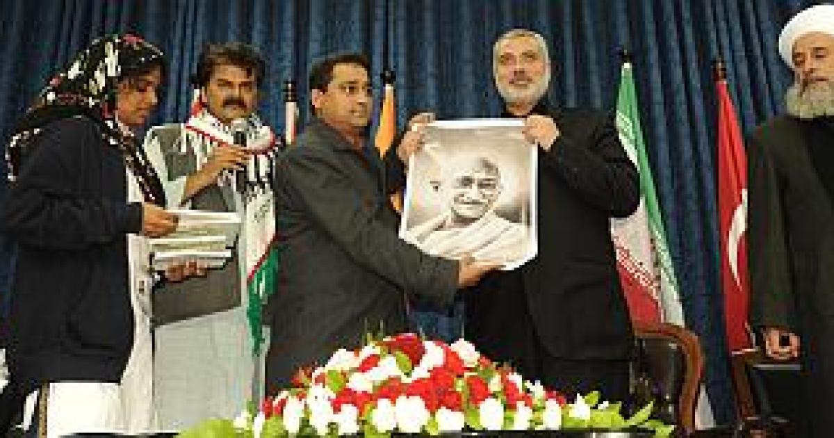 Image: Caravan member Biraj Patnaik presents Palestinian Prime Minister Ismail Haniya with a poster of Mahatma Gandhi.