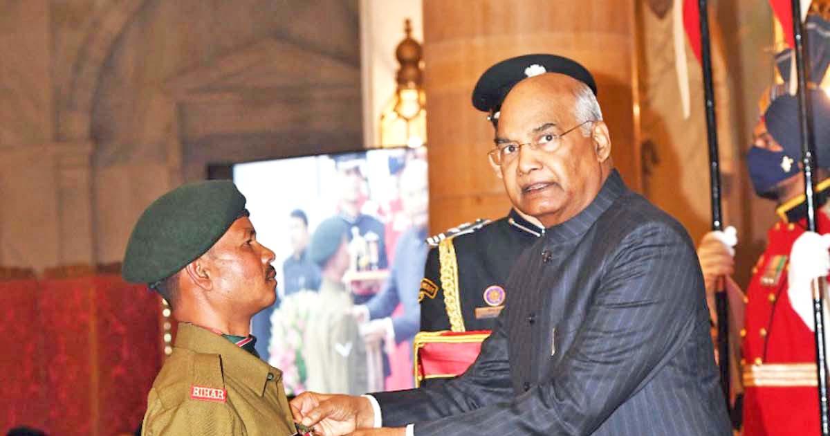 IMAGE: President Kovind presents Shaurya Chakra to Sepoy Karmdeo Oraon, 8th Battalion, The Bihar Regiment.