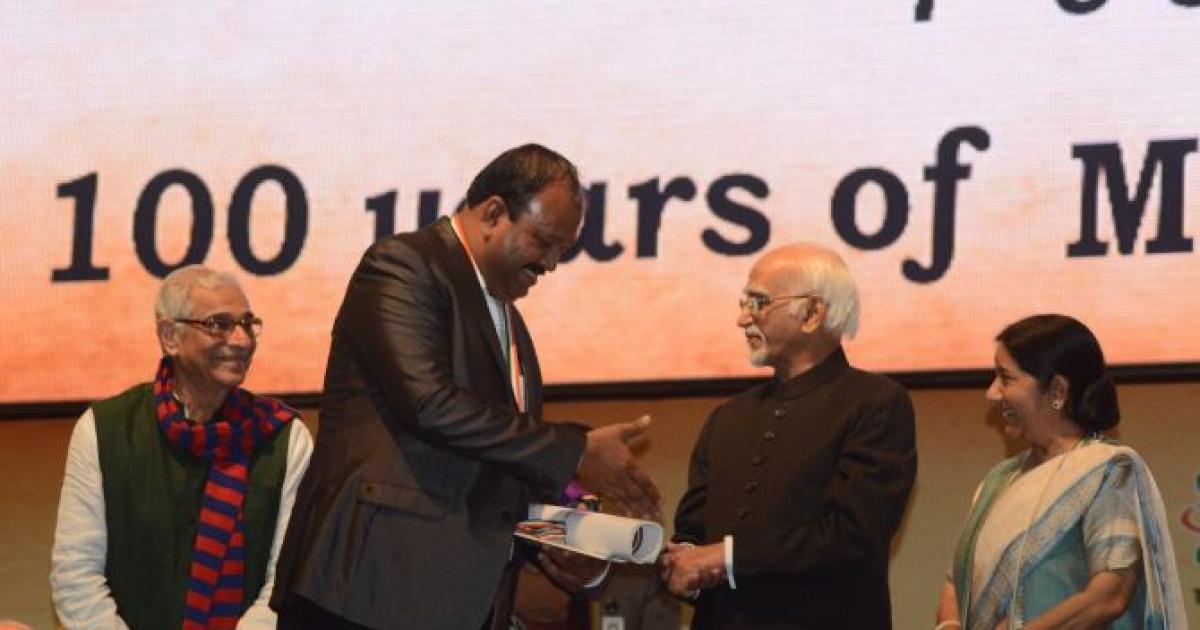 Image: Ashraf Palarakunnummal receives the Pravasi Bharatiya Samman from Vice President Hamid Ansari as External Affairs Minister Sushma Swaraj looks on.