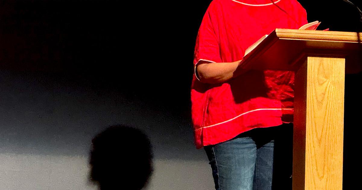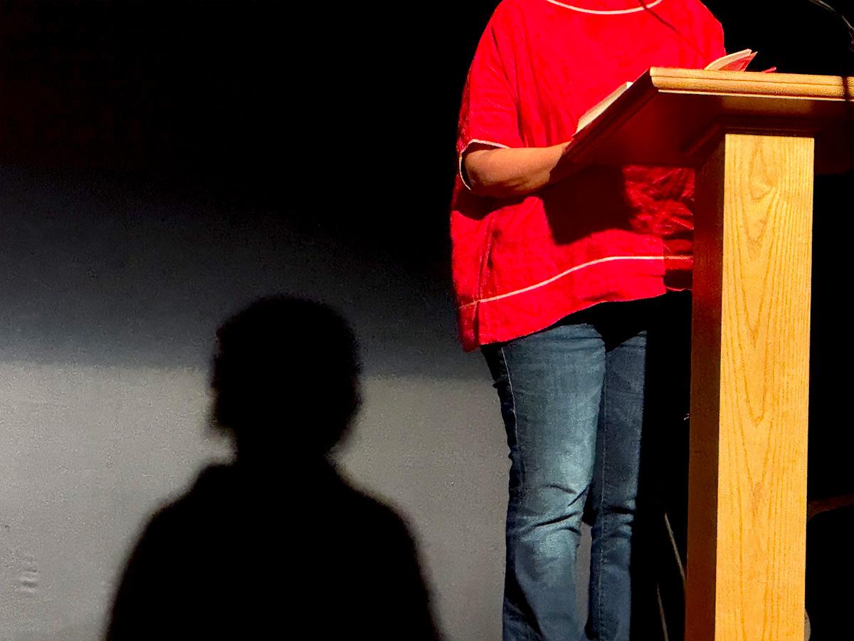 IMAGE: Arundhati Roy reads from her new book Mother Mary Comes to Me at the Mother Mary Hall, St Teresa's College, Kochi, September 2, 2025. Photograph: Kind courtesy Mayank Austen Soofi/X