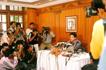 Till fifteen minutes before the start, the Cooch Behar Hall at the Cricket Club of India looked strangely empty. Then, as Raj Singh Dungarpur, in his capacity as president of the CCI, requested cameramen to clear the entrance so that some members could enter, its population assumed more predictable proportions. By the time it began, there was hardly any place to stand. Tendulkar arrived a couple of minutes early from the rear entrance, which means every network in India owes Raj Singh a word of thanks, and then completely vanished from view as photographers created a wall around him. Three minutes later, with no sign of even as much as a change of roll, they had to be moved aside. Tendulkar looked tense, a little older than 26, and sat in front of an army of microphones, a bit like a reluctant groom. "First of all, I am sorry for this delay," he said. "I was not in Mumbai and only arrived last night." Amazingly, he said he only got the news of his appointment several hours after the rest of the country got it. "And then, I saw it on the news!" Was he reluctant to accept? Has he been pushed into a corner? The questions were flying and, to his credit, he didn't flinch. He said he had told everyone concerned, the president of the BCCI, the chairman of the selectors, that he wasn't very keen to accept the job at the moment. And he had told them that 24 hours before he left for a mystery destination now widely believed to be Puttaparthi. "I was not mentally ready... For the last two years I have only thought of playing for India... But now that it has been given to me, I accept. "You normally expect the vice-captain to become the next captain. And ever since I lost the captaincy, I have not been the vice-captain. So I was not thinking of it," he said, and there is no reason to believe that he is not telling the truth. "It was different in 1996," he said. "I had been vice-captain for a long time and had led the team on occasions. So I was prepared to become captain. This time I wasn't." It was an amazingly honest effort and after that, the rest was bound to be an anti-climax. It was just as well that he set the record straight for whispers about him being "pricey" had already started appearing. When you wear the coat of captain of India, you cover the shirt of popularity. He said he was happy with the way the youngsters were playing ("especially Rahul Dravid and Sourav Ganguly" who incidentally are the same age as he is!); that he was happy that Nayan Mongia's catch had been adjudged the best at the World Cup (even though it wasn't the official verdict, only of the Daily Telegraph); that he was happy at being nominated by Wisden Cricket Monthly as the number one batsman in the world, though his answer was a lot more interesting than the question which was predictable. ("I am happy because the two-year period (over which the assessment was made) started in 1997 when everybody said I wasn't batting well...); that he would be happy if the selectors gave him the team he wanted; that he had never laid down the condition that he did not want Azharuddin in the team ("I have played under him and he has played under me so there is no problem").