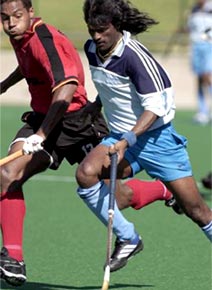 ![]() Dhanraj Pillay comes up with some fine stickwork to mesmerise Germany's Michael Green (no. 13) and score the match-winner in the dying seconds of the match. Photographs: Tony McDonough/ALLSPORT. |