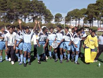 he Indian team does a victory lap with the trophy after the prize distribution. On extreme right (in yellow jersey) is goalkeeper Jude Menezes, who excelled right through the tournament.