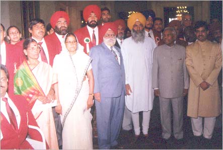 The President and the sports minister are flanked by awardees after the presentation ceremony.