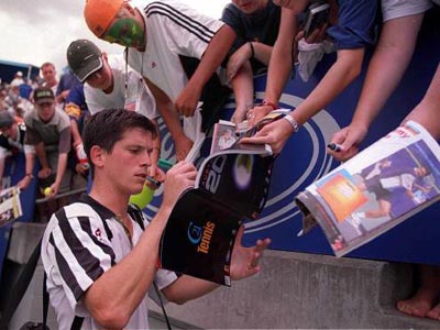 Tim Henman of Great Britain signs autographs after his match against Rainer Schuttler of Germany. Henman defeated Schuttler 6-2, 4-1 after Schuttler retired hurt. NEXT BACK Clive Brunskill /ALLSPORT |
