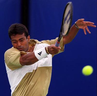 Leander Paes of India plays a forehand return against Andreas Vinciguerra of Sweden. Vinciguerra won 7-6, 6-4, 6-3.
