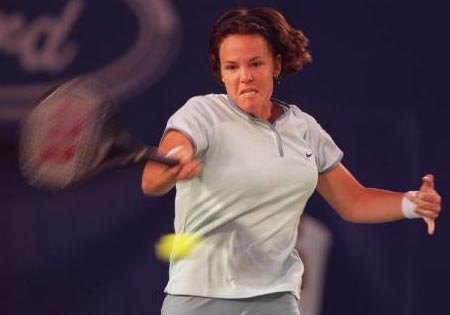 Lindsay Davenport of USA hits a forehand on her way to defeating Julie Halard-Decugis of France in the quarter finals.