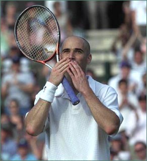 Day Seven VINTAGE AGASSI! With his trademark gunshot return of serve and ruthless efficiency, Agassi steamrolled German David Prinosil 6-4 6-3 6-3 to move to the quarter finals. The trademark blown kisses were also in evidence. Gary M. Prior/ALLSPORT |