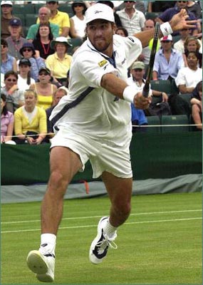 Day Seven I DESERVE IT! Pat Rafter's progress to the quarter finals seems to have vindicated the Wimbledon organizers' decision to seed him despite a low ranking. Here, he lunges to volley against Thomas Johansson. Rafter won 6-3 6-4 6-7 6-1. Stu Forster/ALLSPORT |