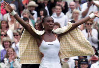 IT'LL BE ME! Venus Williams raises her hands in triumph and looks towards her family after she upset top seed Martina Hingis 6-3 4-6 6-4 to set up a semi final clash with her sister Serena, who was also in the players box.