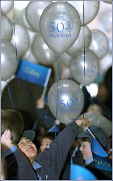 The Final Countdown to Sydney 2000 A little Japanese boy gazes upwards in delight as his balloon floats upwards to join the thousands raised to celebrate the 2000 Sydney Olympics. Scott Barbour/ALLSPORT BACK START |