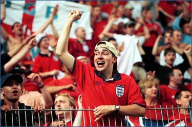 Breaking the German Jinx Finally, something to shout about! For a change, England fans actually do what they came to Belgium to do; i.e. cheering their team on. Here, they celebrate after their 1-0 victory over Germany in the Group A EURO 2000 match at the Stade Communal in Charleroi, Belgium. Gary M. Prior/ALLSPORT NEXT |