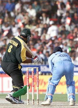 ![]() Pakistan batsman Inzaman-ul Haq edges one into the gloves of Indian wicketkeeper Sabba Karim in Sharjah tri-series at the Sharjah cricket stadium on Thursday. India won the match by five wickets. AFP PHOTO/RABIH MOGHRABI NEXT |