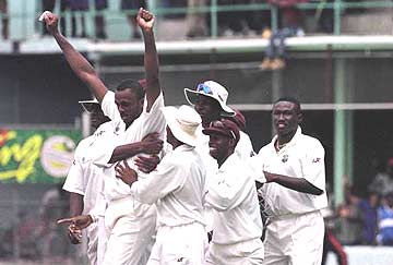 ![]() The West Indies team gather around Walsh after he equalled Kapil's record. 'I'll still make myself available to play as long as the body is fit and I'm doing well. I wouldn't want to play and embarrass myself if I'm not fit and doing well,' he had said last September just before his 37th birthday. Laurence Griffiths/ALLSPORT NEXT |