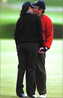 Catherine Zeta Jones kisses her fiance Michael Douglas on the 10th hole