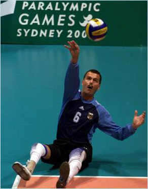 Siegmund Soicke of Germany serves during the Men's Sittting Volleyball Preliminary match against Netherlands. Germany won the match in straight sets (3-0).